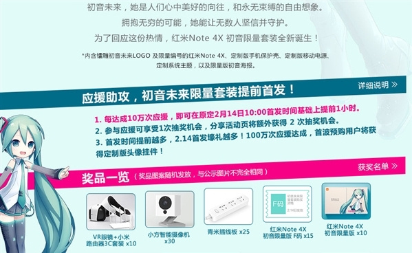 初音未来能带来多少红米销量的提升,现在还很难下定论。在这条路上,Note4X限量版看上去还只是一个起点。2月9日下午,小米的官方微博又发出一组“初音绿”的产品图,包括小米移动电源、手环、路由器、蓝牙耳机、小米盒子、小米净化器、小米note2等产品在内,预示着未来小米还将延续“亲二次元”的品牌策略。