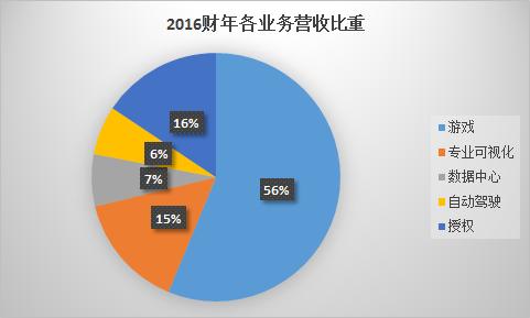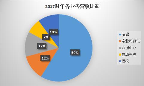 以下两图是2017财年和2016财年各业务所占比重。两者对比可以看出,游戏依然占最大比重,超过50%,并且2017财年的比例比2016财年上升了3%个百分点。自动驾驶比例上升1%,数据中心上升5%。从中看见,以上三大业务是英伟达在2017财年发力的板块。