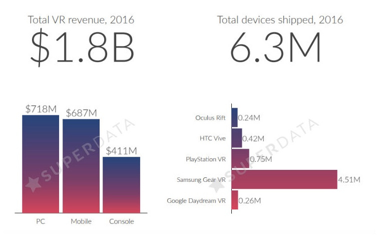 在2016年,整个VR头显市场的销量比较惨淡,几大头显销量都低于预期,市场研究公司Super Data甚至称VR头显基本上是2016年黑五购物季的最大输家。2016年底,Super Data发表研究报告称,2016年全球VR头显预计销量630万台,在几大主要头显中,三星Gear VR销量估计为451万台,索尼PlayStation VR估计75万台(而之前Super Data已经将预期从200万台下调至100万台),HTC Vive是42万,Google Daydream为26万,Oculus Rift垫底,预计24万。