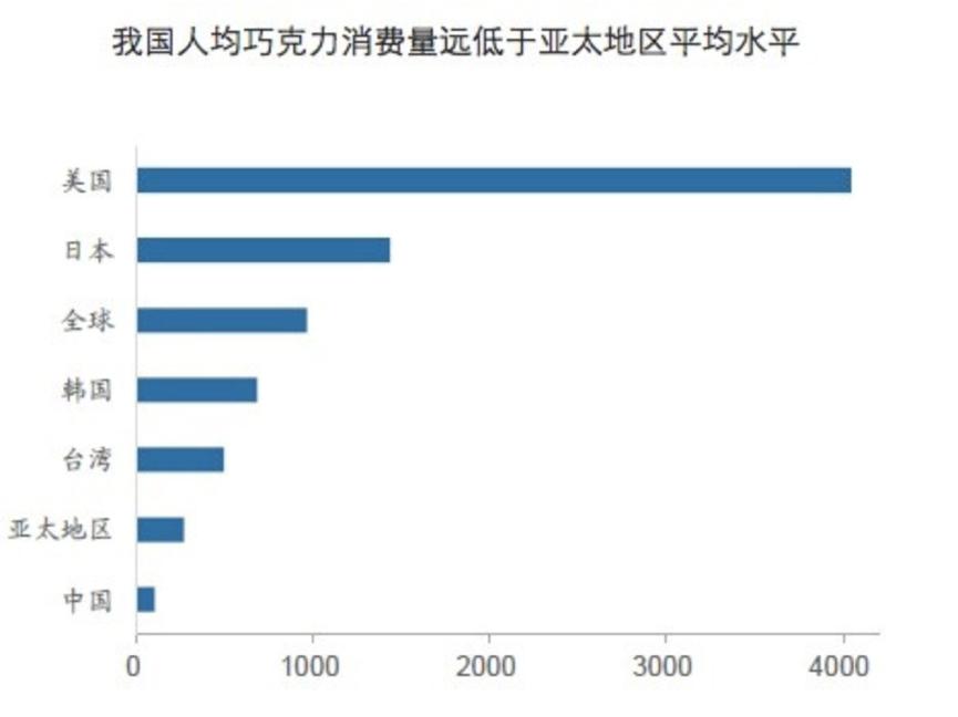 另一项数据则显示,较之全球人均 961g 巧克力的消费水平,中国消费量还仅为 99.8g,未来有巨大增长空间。