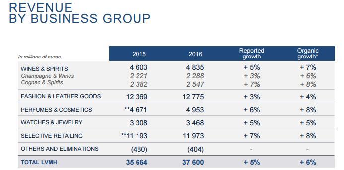 在LVMH集团中,包括LV在内的几个品牌所组成的时尚和皮具部门,2016年的营收为127.75亿欧元,同比增长3%,占整个集团营收的34%。