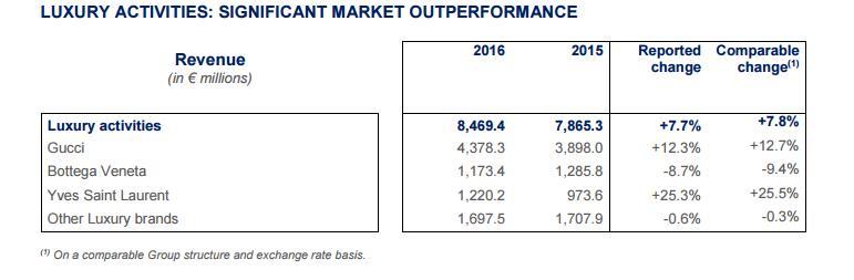 而Kering方面,以Gucci领衔的奢侈品部门,2016年的营收为84.69亿欧元,同比增长7.7%,占整个集团营收的68.38%。其中Gucci与YSL表现出色,BV销量下滑十分厉害。