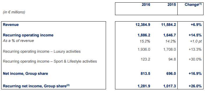 根据财报,2016年 Kering 集团的合并营业收入为123.85亿欧元,同比增长6.9%。经常性营业收入为18.86亿欧元,同比上涨14.5%;净利润同比增长16.9%至8.14亿欧元。按地区分,西欧和除日本外的亚太地区收入增长率达到两位数,美国表现平平,日本有些差强人意。