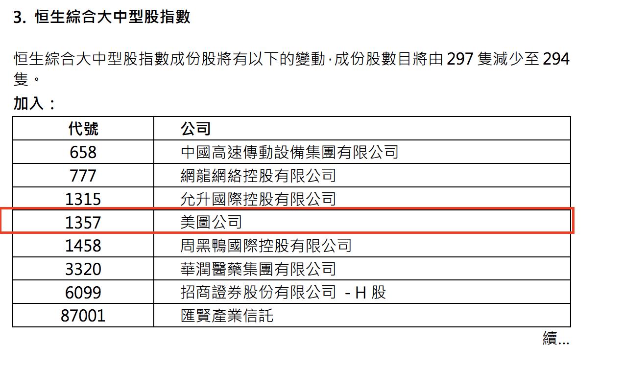 本次美图入选大中型股指数成份股数的同时,股数也将由 297只减少至294只,变更将于2017 年3 月6 日生效。