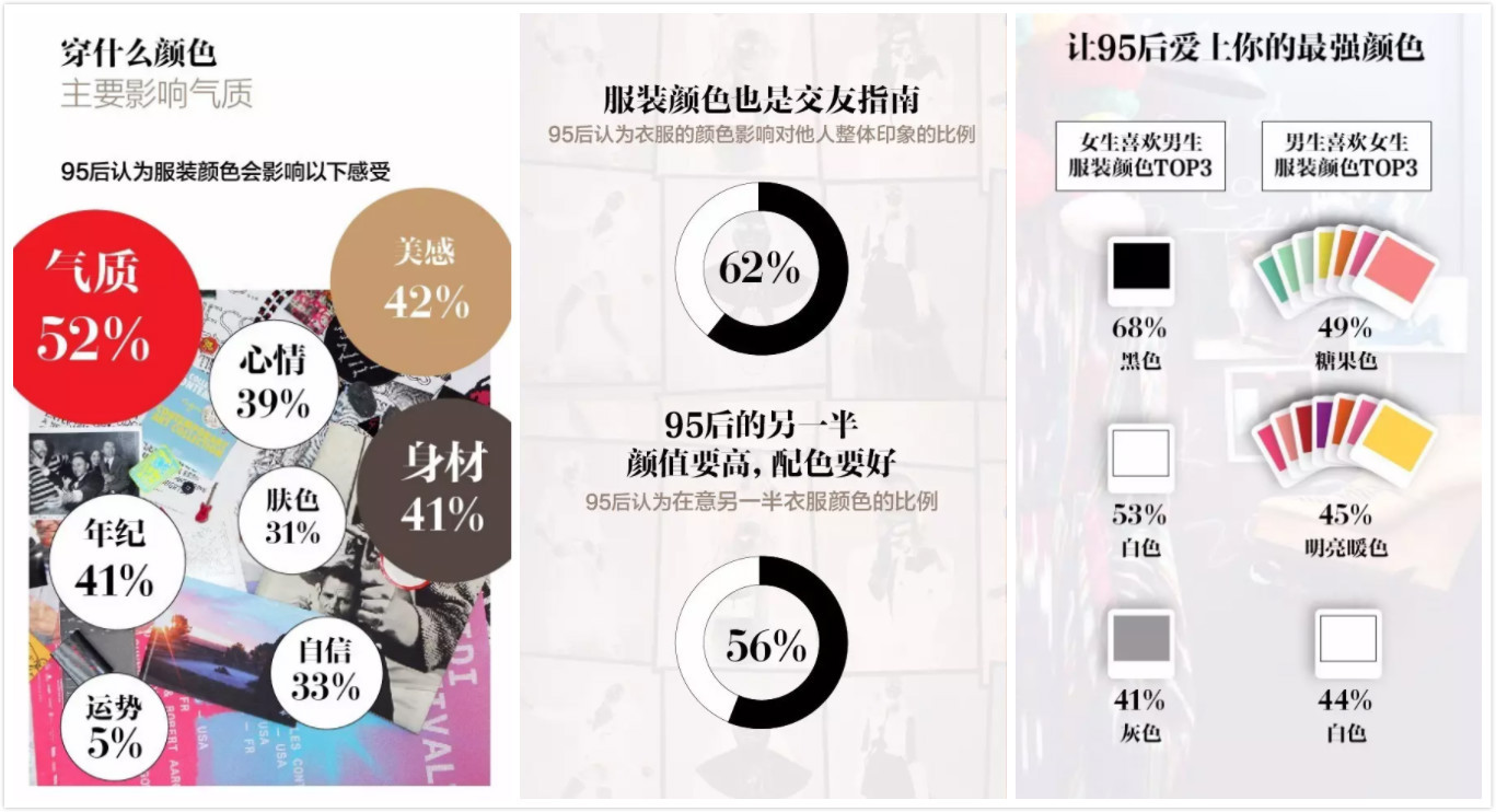 另外,报告还发现95后购买服装时考虑最多的因素为“搭配”:95后最常选择与黑色搭配的颜色是“红、黄、蓝”;最爱买的服装材质分别是棉、羊毛和皮革;最爱买的花色分别是印花、涂鸦和字母。