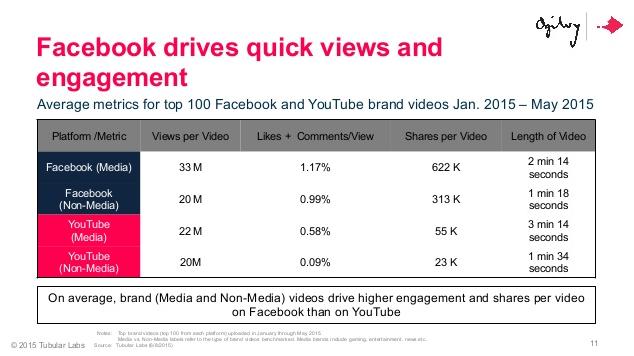 社交网络发力视频确实也有一定的优势,尤其是视频广告等要求更高分享和互动的内容。据数据显示,即便是在2015年前,在Facebook平台上,视频的平均观看量、分享量,还有点击和评论量,都远远超过Youtube,这无疑与Facebook作为一个社交网络的互动性密不相关,这些数量也意味着在Facebook上投放视频或者广告其变现潜力更大。