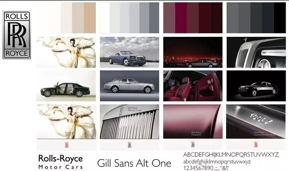 我们继续来看劳斯莱斯的设计环节,通过它的色卡我们可以看到,劳斯莱斯车的元素都有专门的定义,包括LOGO和字体应该是怎样的一种设计,所有的这一切都围绕着品牌的精髓。