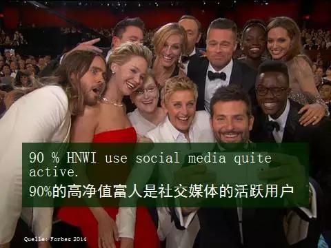 我们可能要换一个角度看这个问题,我们要看一下高净值人群,这张非常著名的自拍照片是一群好莱坞的明星在奥斯卡颁奖典礼上拍的。90%的高净值人群是社交媒体的活跃用户,他们非常多地应用社交网络。所以,你用一些经典、传统的媒体方式根本接触不到这些人,你如果在电视上做广告或者在报纸上做广告,那些人根本碰不到。