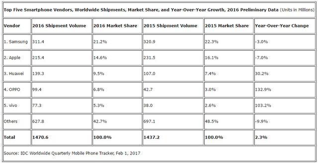 三星和华为是全球第二、第三大手机厂商,都将自主开发语音助手。第一大手机厂商苹果也有自己的Siri。据IDC报告,2016全年,三者相加占据全球市场份额的45.3%。