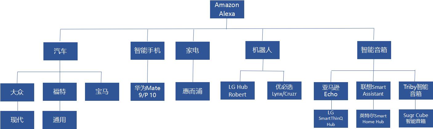 Alexa俘获了一众巨头企业,包括大众、宝马、福特、现代、通用电气、华为、三星、LG、联想、英特尔、惠尔浦,从汽车、家电、手机等各领域无孔不入。此外,美国第二大卫星电视服务商DISH将成为首个直接兼容Alexa的电视服务商。《连线》杂志发表文章称:“Alexa征服了CES,下一步将是全世界。”