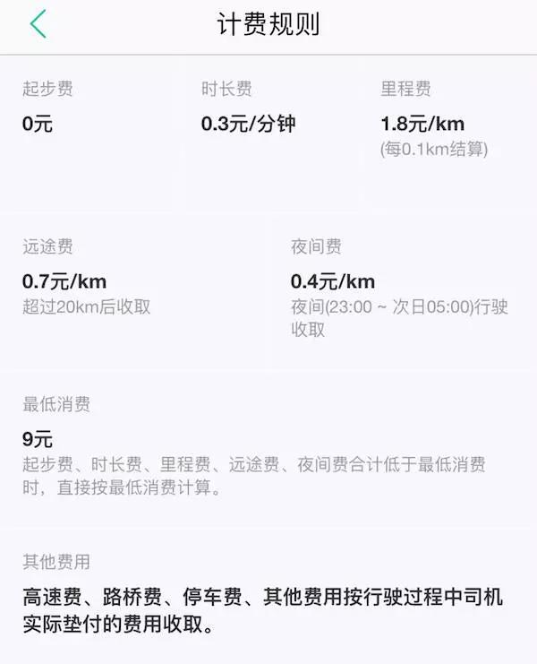 关于价格,美团打车没有起步价,但是有 9 元的最低消费,每分钟 0.3 元,每公里 1.8 元。