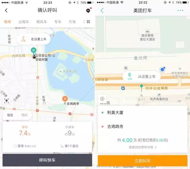 打车页面的 UI、交互设计和滴滴所使用的模式高度类似,如果你是一个用惯了滴滴的用户,完全不需要什么学习成本来适应美团打车。