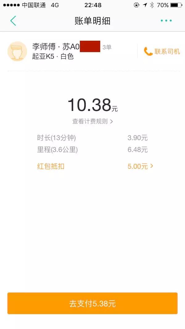 最终,我为这趟行程支付了 5 元出头的费用。我是那个司机今天接的第四单(叫车时间是 22:22)。