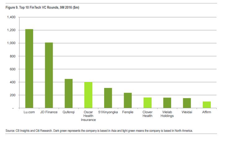 从最直接的原因来看,主要是因为几个中国金融科技企业的融资金额非常大。2016年前9个月,全球最大的十笔金融科技企业的融资,有七笔发生在中国,这也说明了金融科技格局的呈现。你大概会问为什么这里面居然没有去年蚂蚁金服获得45亿融资那笔交易,花旗指出,由于那不是风投资本支持的交易,因此并没有算进下表中(大概算进去了之后坐标轴就不长这样了)。