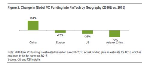 同时,中国也是2016年唯一一个投资增长的主要区域——相较于2015年同期,中国2016年前九个月的金融科技投资将近翻倍。
