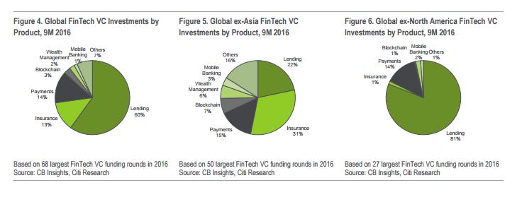 信贷领域的热潮也依然没有散去,尤其是在中国等发展中国家。VC认为P2P信贷领域依然存在机会,因为当地拥有大量未被服务的用户,普惠金融发展仍大有机会。相反,在美国,这很可能变成了一个糅合次级或者接近次级信用卡债务的游戏。将美国剔除在外之后,借贷领域占去年9个月金融领域VC投资的八成,但如果将亚洲(基本就是中国)排除在外,那借贷领域的占比就只有三成了。