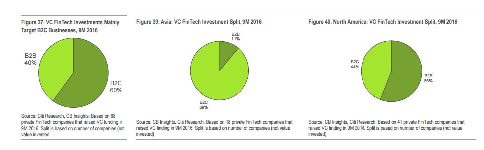 然而,花旗已经开始看到金融科技投资逐渐向B端转移的情况,尤其是有越来越多的传统的金融机构,正在直接或者间接通过风投基金投资金融科技。这些都反映出,金融科技与传统银行业的合作愈发紧密。