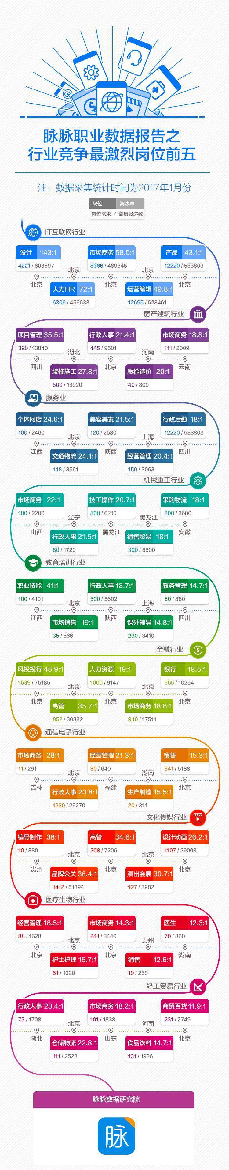 日前,脉脉数据研究院统计分析了2017年1月的站内相关数据,发布了职业数据报告及各行业竞争最激烈岗位前5数据。其中,得出了一些有趣结论: