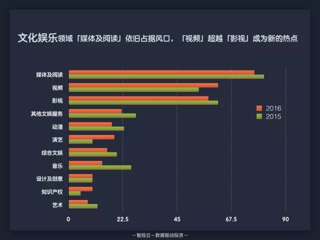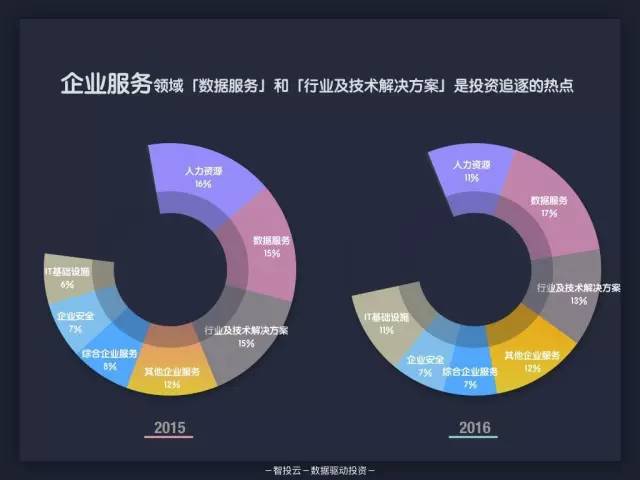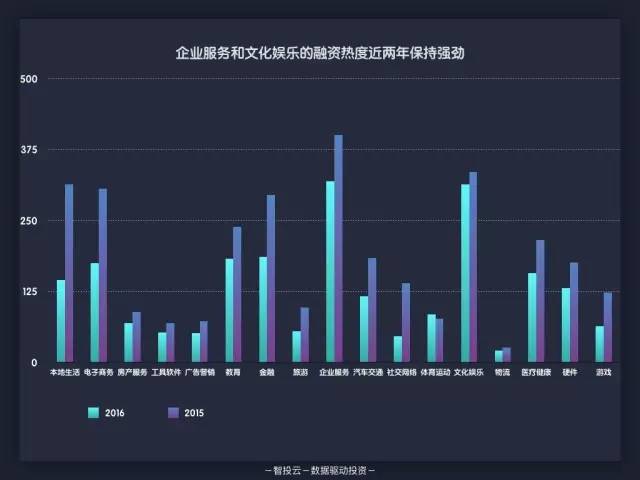从15,16年的行业分布图中可以看出,企业服务和文化娱乐持续保持强劲,占据榜首,而值得注意的是2016年,体育运动是唯一一个超越15年的领域,本地生活,电子商务,社交网络和游戏领域则是大幅度锐减。