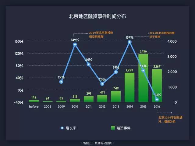 北京地区融资事件的时间分布大体与杭州地区融资事件趋势相似,2016年获投项目数首次下跌,10年,12年与14年出现了获投项目增长率的拐点,2014年北京地区创投热潮达到顶峰,之后便逐年降幅。