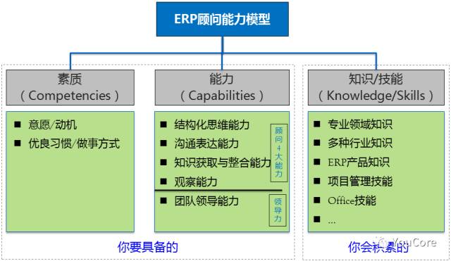 两人后续发展的差距在上面这段聊天中就拉开了。现任总经理的这位其实有整理一份顾问能力模型图(如下图),因此他能够将项目实际工作跟这个能力模型图做比对,将自己做得不到位的地方在能力模型图中找到对应的点(知道与高层对话、监督客户工作进度属于项目管理中干系人管理和进度管理的内容),从而有目的地找方法、途径去弥补(找一本项目管理的书系统学习)。