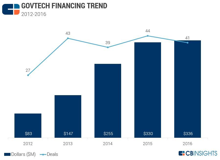 近年来美国政府科技创业公司的融资趋势如下图所示。2016年,美国政府科技创业公司的融资额为3.36亿美元,涉及41笔交易。从2012年到2016年,美国对政府科技创业公司的投资额增长了305%,但只比去年同期增长了2%。相比之下,美国风投支持的金融科技创业公司仅在2016年第三季度就募集了8亿美元。