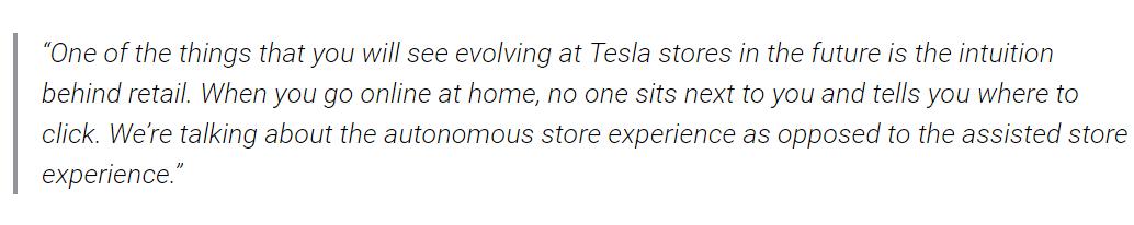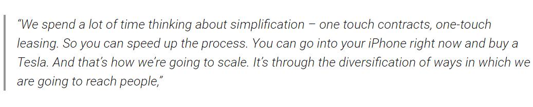 “我们花费了大量时间来简化流程——一键下单、一键租赁。现在你可以点亮你的iPhone,下单买一辆特斯拉。这就是我们扩大销售规模的方案,使我们与潜在客户的联系多样化。”