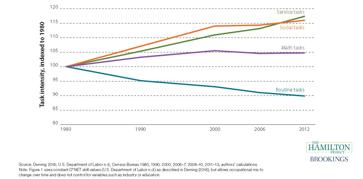 这张图表明,在今天,涉及与人合作的任务(需要更好的非认知技能)的重要性已经比1980年底和1990年代提高了许多。像对社交技能和服务技能的需求已经分别增长了16%和17%,而对高等数学的要求仅增长了5个百分点。