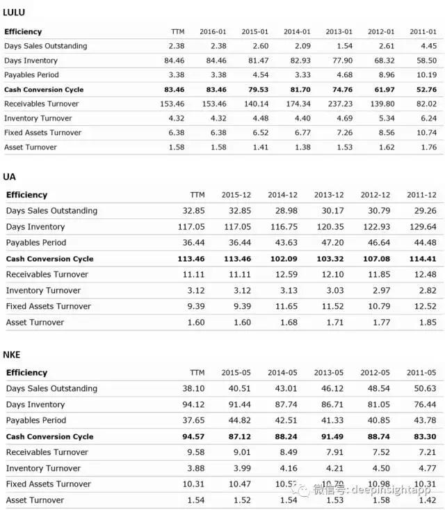 我们再看另一个让人震惊的数据对比:Lululemon的DSO(days sales outstanding)只有2.38天,而UA是32.85天,耐克是38.10天。这意味着什么?也就是说Lululemon只需要2天就能把他的账目变成现金,远远高于竞争对手。这也是来自于Lululemon强大的定价权,并且没有任何的Wholesale业务。这也导致公司的现金周转率也明显好于UA和耐克。