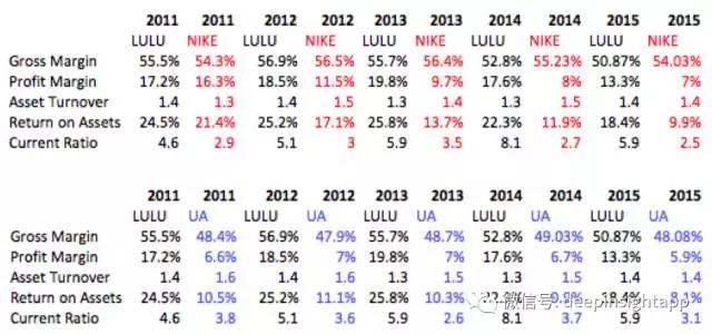 我们把Lululemon和耐克,UA进行一些财务数据的对比,从中看到商业模式中的差异。