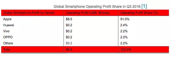 如今,苹果和谷歌取而代之,在手机操作系统上占据着领先地位。调研公司Strategy Analytics去年11月份发布报告称,去年第三季度苹果公司攫取了全球智能手机利润的91%,创下历史新高。BMO Capital Markets则预计去年第三季度苹果攫取了全球智能手机行业103.6%的利润,而苹果在智能手机市场的份额只有12%。为什么超越了100%?因为有大量厂商在亏损。