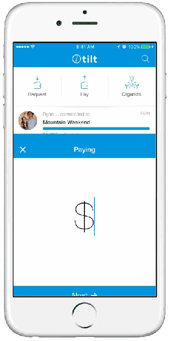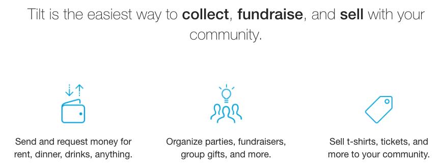 成立于2012年的Tilt,主要业务是做P2P支付交易。目前,公司的主要业务分为三大部分:包括租赁、吃喝的个人支付业务;包括筹办聚会、团队礼物、旅行计划的众筹业务,以及在社区卖衣服、门票的业务。