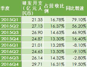 百度四季度研发支出为人民币29.71亿元(约合4.280亿美元)比去年同期增长19.5%,占营收比例为16.3%,为均今年以来最高(具体变化可以看下表)。