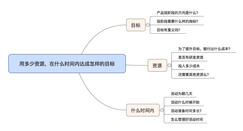 达成什么目标:这应该是最开始的出发点。活动的目的是什么,产品现阶段需要什么,有什么指标要提高?目标可不可以量化,目标与资源的投入产出比是多少?