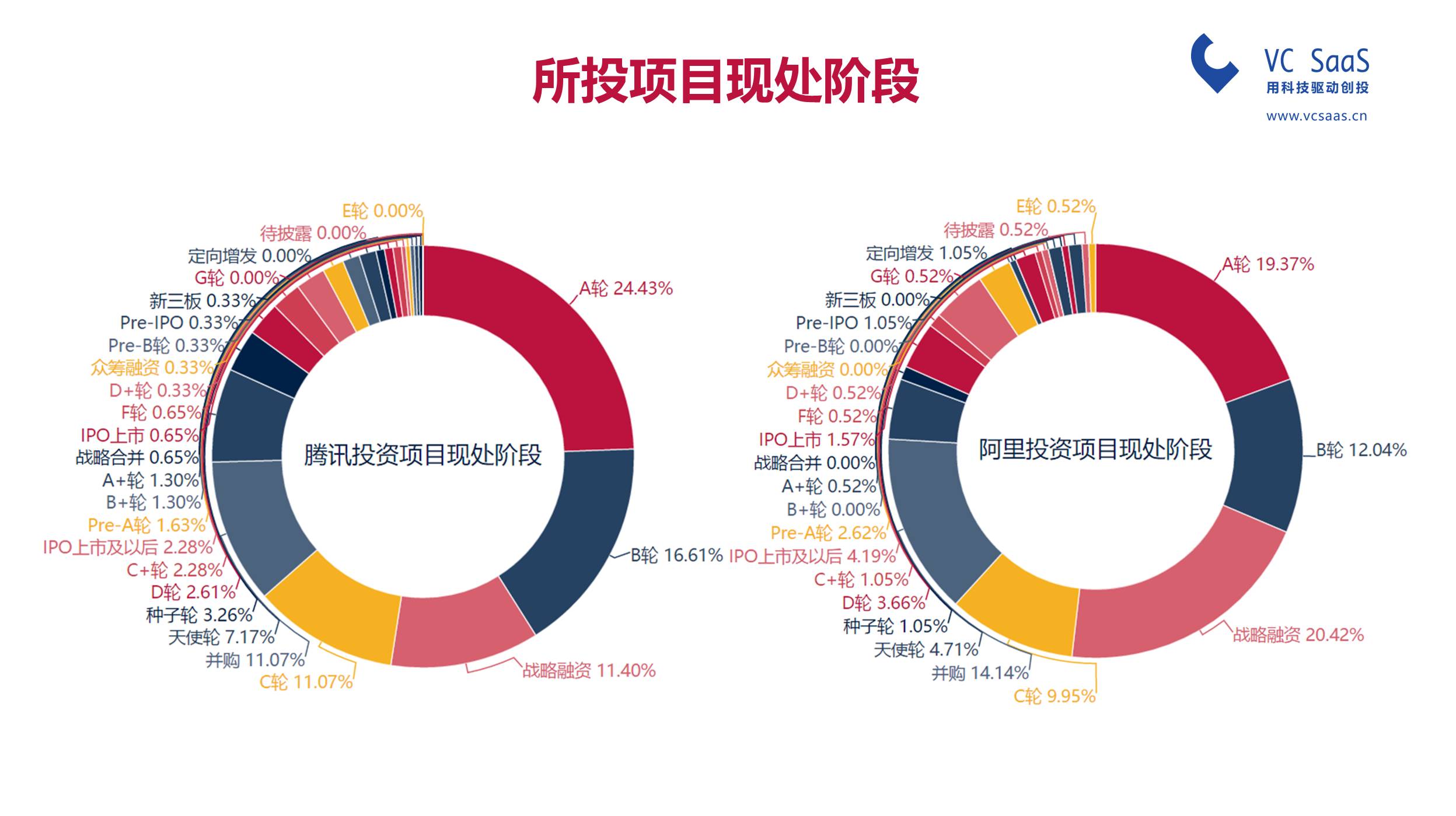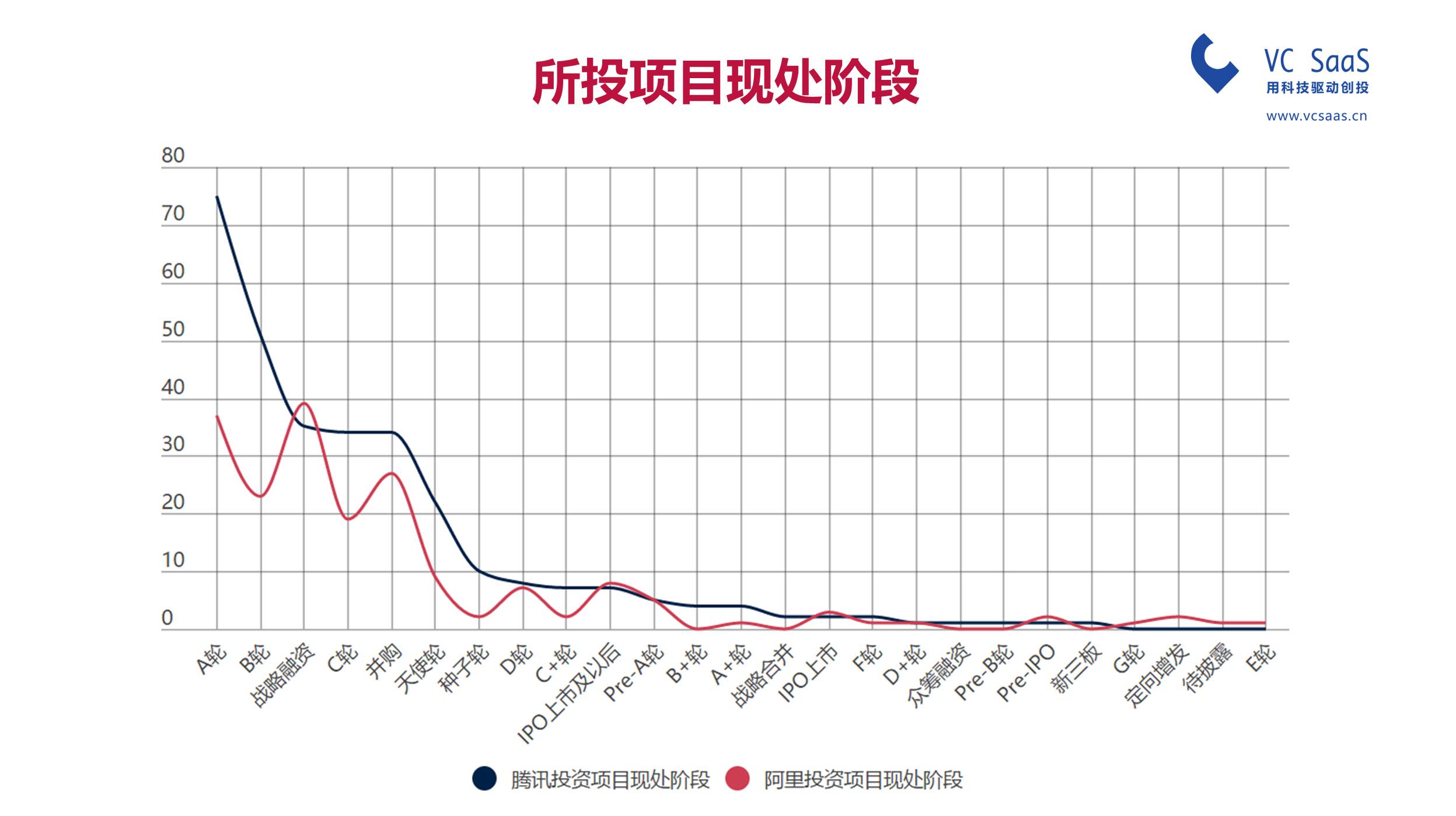腾讯投资投资最多的项目是在A轮(28.92%)、B轮(17.3%)、战略融资(11.8%),而阿里资本投资最多的项目在A轮(20.89%)、B轮(14.67%)、战略融资(16%)。在并购率和战略融资这块看起来,阿里爸爸比腾讯爸爸更加霸气;腾讯爸爸喜欢慢慢培养,阿里爸爸更多的喜欢一次到位。