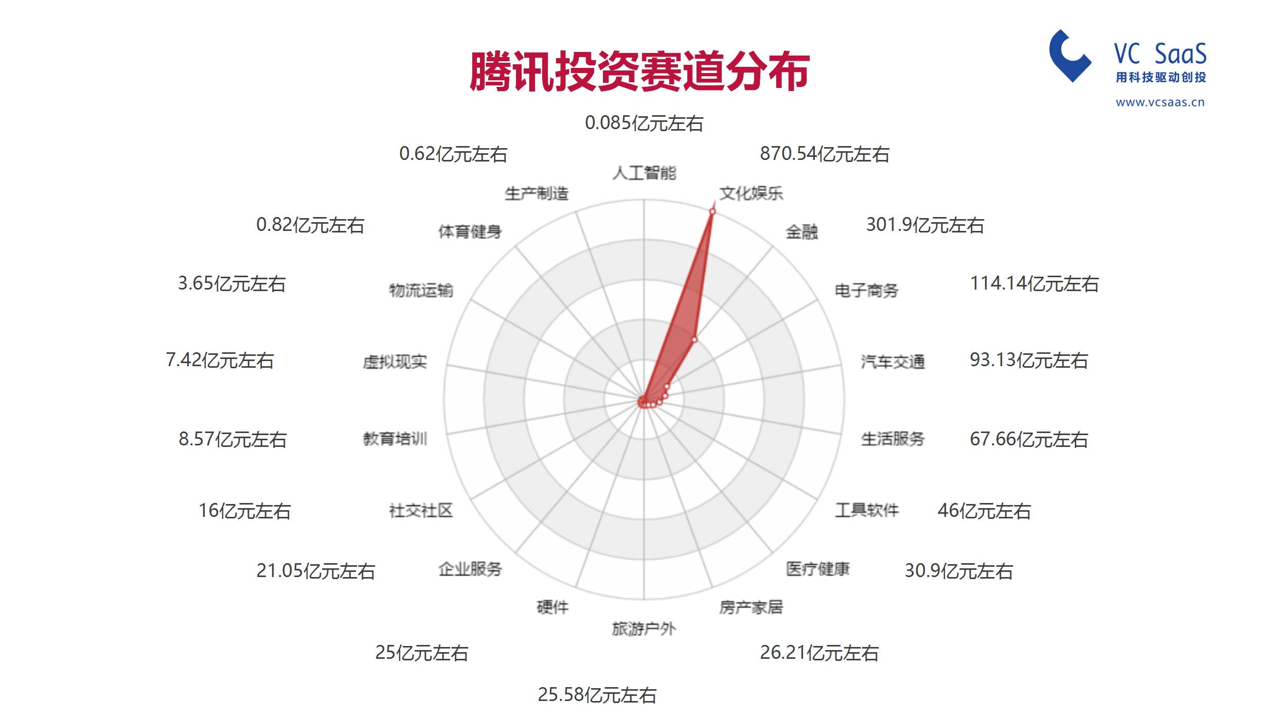 腾讯投资在文化娱乐、金融领域、电子商务这三个方向砸下重金,分别高达870亿、301亿、114亿元。