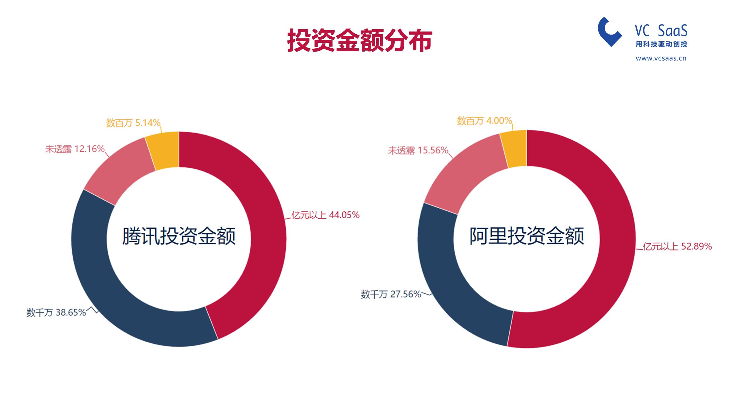 从挥金的角度看,阿里爸爸比腾讯爸爸更舍得撒钱,超过52.89%以上的投资都是亿元级别以上;当然了,腾讯爸爸也喜欢一掷千金,有44.05%的投资是亿元级别以上的。