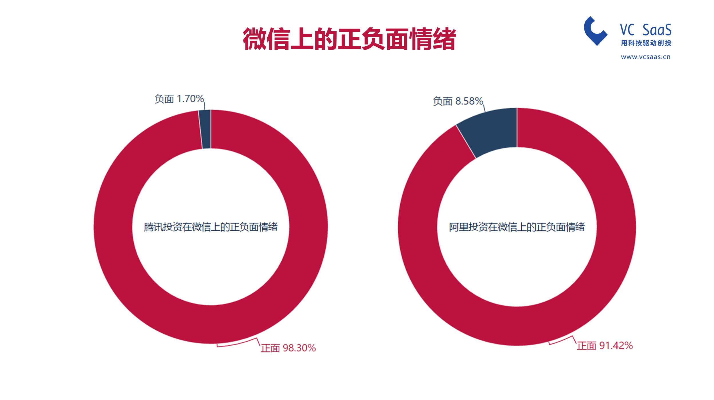 监测了在微信上腾讯投资和阿里资本的正负面情绪,毫无悬念的腾讯在自己的地盘大获全胜,负面的情绪只有1.7%。