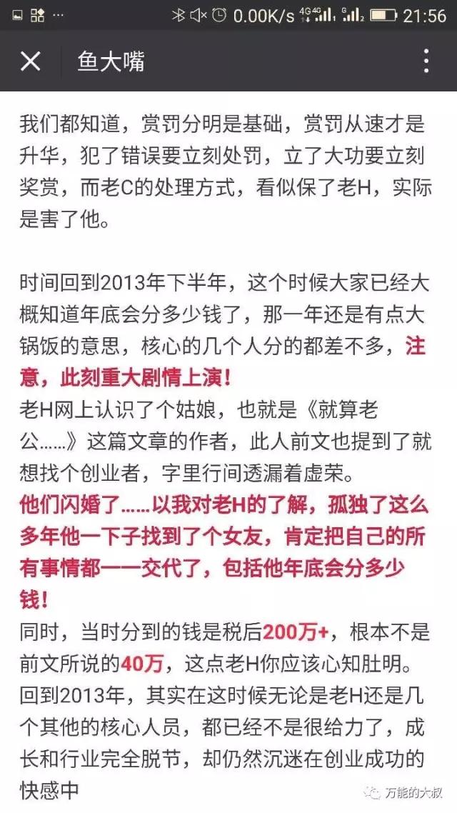 1、事实。清楚了,给了200万分红,不是100万,但确实没给韩股票。实际上,这个事实昨天通过逆转剧情,大家都知道了。老韩能力不行或者态度懈怠,也在昨天的逆转文章中多次提到了,也是大家都知道的。所以,这篇文章实际上没有新的且震撼的事实,能够扭转整个舆论。