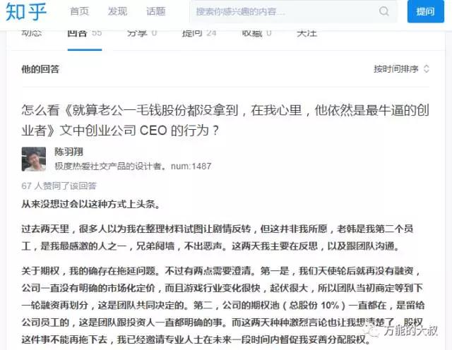 关于期权,我的确存在拖延问题。不过有两点需要澄清。第一是,我们天使轮后就再没有融资,公司一直没有明确的市场化定价,而且游戏行业变化很快,起伏很大,所以团队当初商定等到下一轮融资再划分,这是团队共同决定的。第二,公司的期权池(总股份 10%)一直都在,是留给公司员工的,这是团队跟投资人一直都明确的事。而这两天种种激烈言论也让我想清楚了,股权这件事不能再拖下去,我已经邀请专业人士在未来一段时间内督促我妥善分配股权。