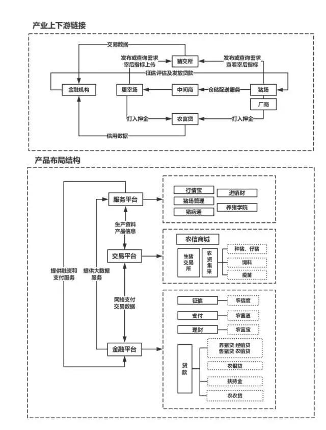 - 金融产品:养猪场资金问题一直是很大的痛点,而如何评估养猪场的信用,是资金端无法放贷的重要原因。目前大北农猪联网推出一系列产品覆盖征信、支付、理财、借贷领域。第一,征信方面,根据养猪场在使用SaaS产品时积累的管理数据,包括农资采购、存栏出栏量、交易等,来客观呈现养猪场的信用状况,解决资金端放贷的痛点。第二,支付方面,使用自主开发的支付结算产品,不依赖第三方,塑造闭环。第三,理财方面,与银华基金管理有限公司共同推出一款现金理财产品-农富宝,下沉到三四线小B用户的理财需求。第四,借贷方面,首先透过旗下小额贷款公司,推出养猪场面对上下游资金压力的产品,如养猪贷、经销贷、售猪贷、农销贷。其二,对接银行资金方,以用户交易数据和自身积累的信用为依据提供贷款,即农银贷。另一方面,推出扶持金和农农贷产品,前者是打造 “先拉货、后付款”的赊销购货体验,养猪场完成认证后,可以获得一定额度、账期的赊销,解决农资经销商靠提供赊销来卖货的痛点;而后者是链接上、中、下游用户的P2P贷款