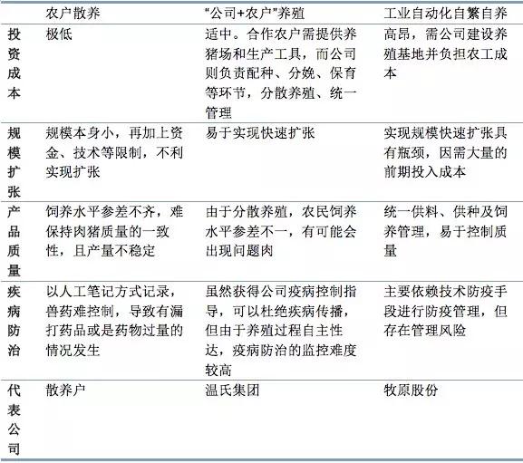 目前,主要的养殖模式分为三类,如下表所示。从饲养模式区分为自繁自养(包含农户散养和工业化自繁自养)与“公司+农户”养殖;从现代化程度分为传统人工养殖与工业自动化养殖,其中“公司+农户”养殖在行业上来说有传统人工和工业自动化两种方式。具体分析如下: