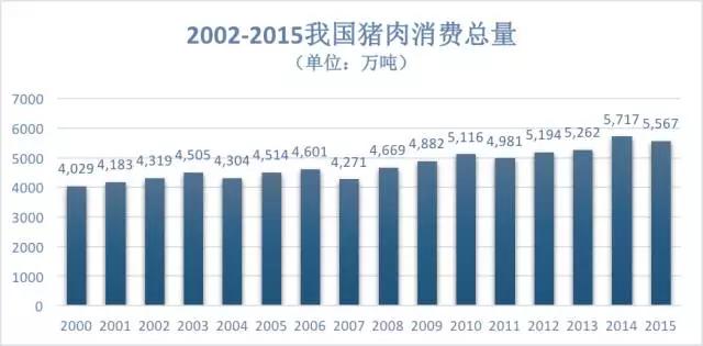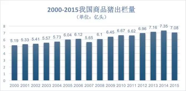从供给来看,我国生猪存栏量、出栏量一直位于世界前列。在生猪存栏量方面,2015年我国生猪存栏量为45113万头,占世界生猪存栏量的59.3%。在生猪出栏量方面,从2000年以来,我国商品猪出栏量一直保持稳定增长,从2000年的5.19亿头,增长到2015年7.08亿头,年均增长率超过2%。若以2016年底猪肉生猪交易平均价格每公斤18元,一头商品猪110公斤计算,则生猪交易年市场规模1.38万亿,为万亿级市场。