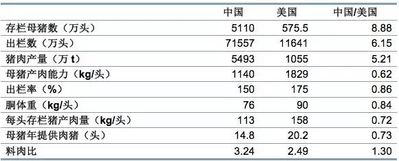 由散户为主的我国养猪行业,与美国相比,我国生猪生产效率处较低水平。不论是在生猪出栏率、每头存栏猪产肉量、母猪年提供肉猪头数、母猪产肉能力、料肉比等,皆有相当大的差距。