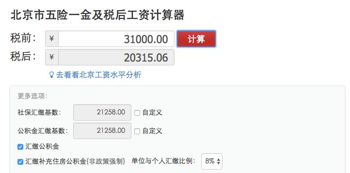 公司在北京,税后20K,反推税前收入应该很可能在31000元以上。