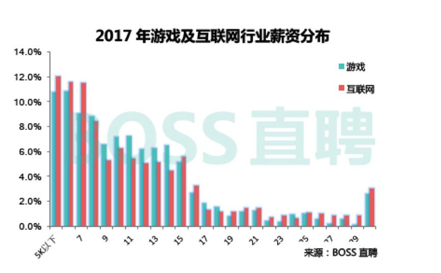 游戏行业中处在“夹心层”(月薪10k-20k) 的人数占比高于互联网行业均值。