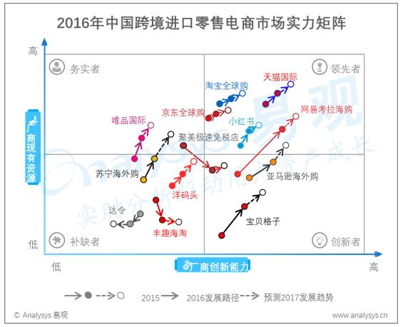 从易观最近发布的《2016年中国跨境进口零售电商市场实力矩阵》来看,这一市场中的领先者为天猫国际、淘宝全球购、京东全球购、网易考拉海购、小红书。过去一年,这一市场只有进入者,还没有退出者。