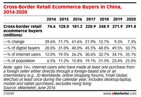 据eMarkter数据,预计2017年将有1.81亿中国消费者选择跨境购物,这一增幅达到21.9%。另有数据显示,2016年国内消费者跨境购物的花费将近3827亿元(约合860亿美元)。
