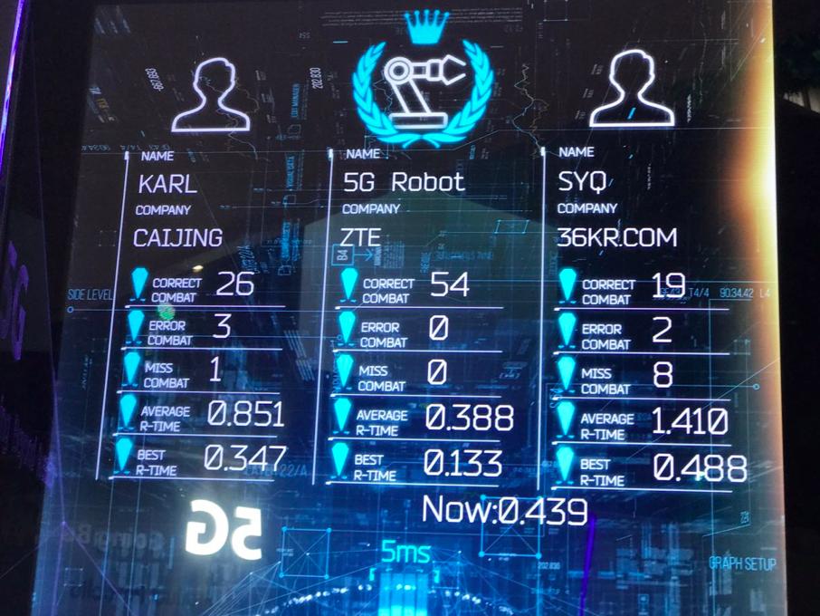 5G的另一个特点是低时研,现场ZTE搭设了一套机器与双人对战的“打地鼠”游戏机,从在现场观看和体验来看,基本都不是机器的对手。
