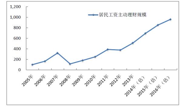 经测算,2016年居民工资主动理财规模为960,62元。如图所示,除了2008年和2012年受金融危机和经济大环境影响,居民理财规模有过短暂波动外,近年来居民工资理财规模一直呈上升态势。
